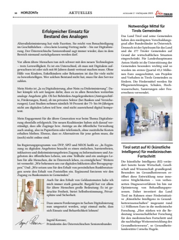 10 aktuelles ausgabe 2 %u00b7 fr%u00fchjahr 2025Erfolgreicher Einsatz f%u00fcr Bestand des AnalogenIngrid Korosec, Pr%u00e4sidentin des %u00d6sterreichischen SeniorenbundesAltersdiskriminierung hat viele Facetten. Sie reicht von Benachteiligung im Gesch%u00e4ftsleben %u2013 etwa kein Leasing-Vertrag mehr %u2013 bis zur Digitalisierung. Der %u00d6sterreichische Seniorenbund sagt immer wieder, dass in dem Bereich niemand zur%u00fcckgelassen werden darf.Vor allem %u00e4ltere Menschen tun sich schwer mit den neuen Technologien %u2013 trotz Lernwilligkeit. Es ist ein Unterschied, ob man mit Digitalem aufgewachsen ist oder sich mit 80 Jahren damit vertraut machen muss. Ohne Hilfe von Kindern, Enkelkindern oder Bekannten ist das f%u00fcr viele nicht zu bewerkstelligen. Wer solchen Beistand nicht hat, muss f%u00fcr den Service zahlen.Mein Motto ist %u201eJa zu Digitalisierung, aber Nein zu Diskriminierung%u201c. Daher k%u00e4mpfe ich seit langem daf%u00fcr, dass es in allen Bereichen weiterhin analoge Angebote gibt. Ob bei Beh%u00f6rden-Angelegenheiten (Amtsgesch%u00e4fte, F%u00f6rderungen, Boni), ob im privaten Sektor (bei Banken und Versicherungen). Laut Studien nehmen n%u00e4mlich 50 Prozent der 75- bis 84-J%u00e4hrigen nicht am digitalen Leben teil bzw. sind nicht ausreichend digital kompetent. Mein Engagement f%u00fcr die %u00e4ltere Generation war beim Thema Digitalisierung ebenfalls erfolgreich. Die neuen Koalition%u00e4re haben sich darauf verst%u00e4ndigt,%u00a0dass alle Zug%u00e4nge bzw. Antr%u00e4ge an die %u00f6ffentliche Verwaltung auch analog, also in Papierform oder telefonisch, ohne zus%u00e4tzliche Kosten erhalten bleiben. Ebenso, dass es Alternativen f%u00fcr jene geben muss, die (noch) nicht online sind. Im Regierungsprogramm von %u00d6VP, SP%u00d6 und NEOS hei%u00dft es: %u201eIn Erg%u00e4nzung zu digitalen Angeboten braucht es einen einfachen, barrierefreien, inklusiven und diskriminierungsfreien Zugang zu Informationen und Angeboten des %u00f6ffentlichen Lebens, um eine Teilhabe und ein analoges Leben f%u00fcr alle Menschen, die in %u00d6sterreich leben, zu erm%u00f6glichen.%u201c Weiters ist vermerkt: %u201eWir bekennen uns zur digitalen Inklusion aller Bezugsgruppen.%u201c Und: %u201eWir setzen uns f%u00fcr den Erhalt von pers%u00f6nlichen Bankberatungen sowie den Erhalt von Poststellen ein. Erg%u00e4nzend forcieren wir den Zugang zu Bankomaten in Gemeinden.%u201c Auch f%u00fcr den Erhalt von Geldautomaten habe ich mich immer stark gemacht. Bargeld hat vor allem f%u00fcr %u00e4ltere Menschen gro%u00dfe Bedeutung: Es ist gedruckte Freiheit, bietet Selbstbestimmung, Privatsph%u00e4re und Sicherheit.Dass unsere Forderungen in Sachen Digitalisierung nun umgesetzt werden, zeigt einmal mehr, dass sich Einsatz und Beharrlichkeit lohnen!Notwendige Mittel f%u00fcr Tirols Gemeinden Tirol setzt auf KI (k%u00fcnstliche Intelligenz) f%u00fcr medizinischen FortschrittDas Land Tirol und seine Gemeinden haben den niedrigsten Verschuldungsgrad aller Bundesl%u00e4nder in %u00d6sterreich. Dennoch ist der Spielraum f%u00fcr das Land und die 277 Tiroler Gemeinden auf Grund der wirtschaftlichen Situation eingeschr%u00e4nkt. F%u00fcr Landeshauptmann Anton Mattle ist die Unterst%u00fctzung der Gemeinden besonders wichtig und so wurden im ersten Quartal 43,2 Millionen Euro ausgesch%u00fcttet, um Projekte und Vorhaben in Tirols Gemeinden zu f%u00f6rdern. Die F%u00f6rdermittel werden f%u00fcr Pflegeeinrichtungen, Schulen, Hochwasserschutz, Sanierungen oder Feuerwehren verwendet. Die k%u00fcnstliche Intelligenz (KI) ver%u00e4ndert bereits heute Wirtschaft, Gesellschaft und Wissenschaft grundlegend. Besonders im Gesundheitswesen er%u00f6ffnet diese Entwicklung neue innovative M%u00f6glichkeiten %u2013 von verbesserten Diagnoseverfahren bis hin zur Optimierung von Behandlungsprozessen. Daher investiert das Land Tirol im Rahmen einer F%u00f6rderinitiative %u201eK%u00fcnstliche Intelligenz in Gesundheitswissenschaften%u201c insgesamt rund 1,1 Millionen Euro in die medizinische Forschung. %u201eHier st%u00e4rken wir die Bedeutung wissenschaftlicher Forschung f%u00fcr den medizinischen Fortschritt und die nachhaltige Weiterentwicklung des Gesundheitswesens%u201c, so Gesundheitslandesr%u00e4tin Cornelia Hagele.