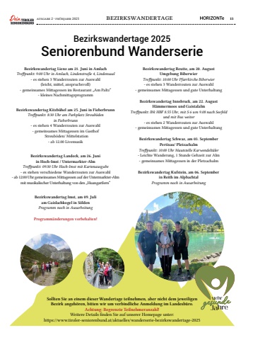ausgabe 2 %u00b7 fr%u00fchjahr 2025 bezirkswandertage 15Bezirkswandertag Lienz am 21. Juni in AmlachTreffpunkt: 9:00 Uhr in Amlach, Lindenstra%u00dfe 4, Lindensaal- es stehen 3 Wanderrouten zur Auswahl (leicht, mittel, anspruchsvoll) - gemeinsames Mittagessen im Restaurant %u201eAm Paltz%u201c - kleines NachmittagsprogrammBezirkswandertag Kitzb%u00fchel am 25. Juni in FieberbrunnTreffpunkt: 8:30 Uhr am Parkplatz Streub%u00f6den in Fieberbrunn- es stehen 4 Wanderrouten zur Auswahl - gemeinsames Mittagessen im Gasthof Streub%u00f6den/ Mittelstation - ab 12.00 LivemusikBezirkswandertag Landeck, am 26. Juni in Hoch-Imst / Untermarkter-AlmTreffpunkt: 09:30 Uhr Hoch-Imst mit Kartenausgabe- es stehen verschiedene Wanderrouten zur Auswahl- ab 12:00 Uhr gemeinsames Mittagessen auf der Untermarkter-Alm mit musikalischer Unterhaltung von den %u201eHuangartlern%u201cBezirkswandertag Imst, am 09. Juliam Gaislachkogel in S%u00f6ldenProgramm noch in AusarbeitungProgramm%u00e4nderungen vorbehalten!Bezirkswandertag Schwaz, am 03. September Pertisau/ PletzachalmTreffpunkt: 10:00 Uhr Mautstelle Karwendelt%u00e4ler- Leichte Wanderung, 1 Stunde Gehzeit zur Alm - gemeinsames Mittagessen in der Pletzachalm Bezirkswandertag Innsbruck, am 22. August H%u00e4mmermoos und GaistalalmTreffpunkt: Ibk HBF 8.55 Uhr, mit S 6 um 9.08 nach Seefeld und mit Bus weiter- es stehen 2 Wanderrouten zur Auswahl - gemeinsames Mittagessen und gute Unterhaltung Bezirkswandertag Kufstein, am 06. Septemberin Reith im AlpbachtalProgramm noch in AusarbeitungBezirkswandertage 2025Seniorenbund WanderserieBezirkswandertag Reutte, am 20. August Umgebung BiberwierTreffpunkt: 10:00 Uhr Pfarrkirche Biberwier- es stehen 3 Wanderrouten zur Auswahl- gemeinsames Mittagessen und gute Unterhaltung Sollten Sie an einem dieser Wandertage teilnehmen, aber nicht dem jeweiligen Bezirk angeh%u00f6ren, bitten wir um verbindliche Anmeldung im Landesb%u00fcro.Achtung: Begrenzte Teilnehmeranzahl!Weitere Details finden Sie auf unserer Homepage unter: https://www.tiroler-seniorenbund.at/aktuelles/wanderserie-bezirkswandertage-2025MehrJahre