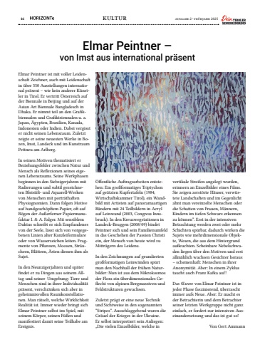 16 kultur ausgabe 2 %u00b7 fr%u00fchjahr 2025Elmar Peintner %u2013 von Imst aus international pr%u00e4sentElmar Peintner ist mit voller Leidenschaft Zeichner, auch mit Leidenschaft in %u00fcber 350 Ausstellungen international pr%u00e4sent %u2013 wie kein anderer K%u00fcnstler in Tirol. Er vertritt %u00d6sterreich auf der Biennale in Beijing und auf der Asian Art Biennale Bangladesch in Dhaka. Er nimmt teil an den Grafikbiennalen und Grafiktriennalen u. a. Japan, %u00c4gypten, Brasilien, Kanada, Indonesien oder Indien. Dabei vergisst er nicht seinen Lebensraum. Zuletzt zeigte er seine neuesten Werke in Bozen, Imst, Landeck und im Kunstraum Pettneu am Arlberg. In seinen Motiven thematisiert er Beziehungsfelder zwischen Natur und Mensch als Reflexionen seines eigenen Lebensraums. Seine Werkphasen beginnen in den Siebzigerjahren mit Radierungen und subtil gezeichneten Bleistift- und Aquarell-Werken von Menschen mit portr%u00e4thaften Physiognomien. Dann folgen Motive auf handgesch%u00f6pftem Papier, oft auf B%u00f6gen der Au%u00dferferner Papiermanufaktur I. & A. Falger. Mit sensiblem Duktus schreibt er sich Empfundenes von der Seele, l%u00e4sst sich von vorgegebenen Linien alter Kanzleiformulare oder von Wasserzeichen leiten. Fragmente von Pflanzen, Moosen, Str%u00e4uchern, Bl%u00e4ttern, %u00c4sten dienen ihm als Sujet. In den Neunzigerjahren und sp%u00e4ter findet er zu Dingen aus seinem Alltag und seiner Umgebung: Tiere und Menschen sind in ihrer Individualit%u00e4t pr%u00e4sent, verschr%u00e4nken sich aber in geheimnisvollen Raumkonstellationen. Man r%u00e4tselt, welche Wirklichkeit Realit%u00e4t ist. Immer wieder bringt sich Elmar Peintner selbst ins Spiel, mit seinem K%u00f6rper, seinen F%u00fc%u00dfen und manifestiert damit seine Teilhabe am Ereignis. Von Gert Ammann%u00d6ffentliche Auftragsarbeiten entstehen: Ein gro%u00dfformatiges Triptychon auf ge%u00e4tzten Kupfertafeln (1984, Wirtschaftskammer Tirol), ein Wandbild mit Artisten auf panoramaartigen B%u00e4ndern mit 24 Teilbildern in Acryl auf Leinwand (2003, Congress Innsbruck). In den Kreuzwegstationen in Landeck-Bruggen (2008/09) bindet Peintner sich und sein Familienumfeld in das Geschehen der Passion Christi ein, der Mensch von heute wird zu Mittr%u00e4gern des Leidens.In den Zeichnungen auf grundierten gro%u00dfformatigen Leinw%u00e4nden sp%u00fcrt man den Nachhall der fr%u00fchen Naturbilder: Nun ist aus dem Mikrokosmos der Flora ein %u00fcberdimensionales Geflecht von alpinen Bergmassiven und Feldstrukturen gewachsen.Zuletzt pr%u00e4gt er eine neue Technik und Sichtweise in den sogenannten %u201cStripes%u201c. Ausschlaggebend waren die Gr%u00e4uel der Krieges in der Ukraine. Er selbst interpretiert sein Anliegen: %u201eDie vielen Einzelbilder, welche in vertikale Streifen angelegt wurden, erinnern an Einzelbilder eines Films. Sie zeigen zerst%u00f6rte H%u00e4user, verw%u00fcstete Landschaften und im Gegenlicht ahnt man vereinzelte Menschen oder die Schatten von Frauen, M%u00e4nnern, Kindern im tiefen Schwarz erkennen zu k%u00f6nnen%u201c. Erst in der intensiven Betrachtung werden zwei oder mehr Schichten sp%u00fcrbar, dadurch wirken die Sujets wie mehrdimensionale Objekte, Wesen, die aus dem Hintergrund aufleuchten. Scheinbare Nebelschwaden liegen %u00fcber den Motiven und erst allm%u00e4hlich wachsen Gesichter heraus %u2013 schemenhaft: Menschen in ihrer Anonymit%u00e4t. Aber: In einem Zyklus taucht auch Franz Kafka auf!Das %u0152uvre von Elmar Peintner ist in jeder Phase faszinierend, %u00fcberrascht immer aufs Neue. Aber: Er macht es der Betrachterin und dem Betrachter seiner letzten Werkgruppe nicht ganz einfach, er fordert zur intensiven Auseinandersetzung und das ist gut so!