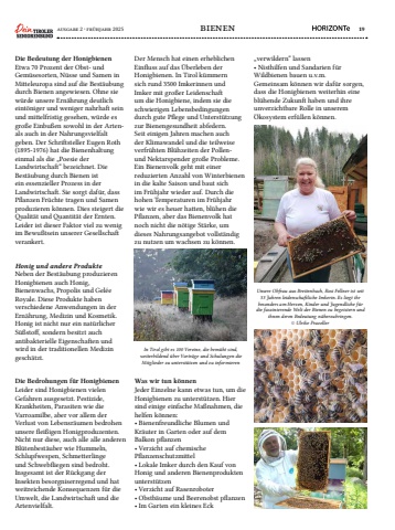 ausgabe 2 %u00b7 fr%u00fchjahr 2025 bienen 19Die Bedeutung der HonigbienenEtwa 70 Prozent der Obst- und Gem%u00fcsesorten, N%u00fcsse und Samen in Mitteleuropa sind auf die Best%u00e4ubung durch Bienen angewiesen. Ohne sie w%u00fcrde unsere Ern%u00e4hrung deutlich eint%u00f6niger und weniger nahrhaft sein und mittelfristig gesehen, w%u00fcrde es gro%u00dfe Einbu%u00dfen sowohl in der Artenals auch in der Nahrungsvielfalt geben. Der Schriftsteller Eugen Roth (1895-1976) hat die Bienenhaltung einmal als die %u201ePoesie der Landwirtschaft%u201c bezeichnet. Die Best%u00e4ubung durch Bienen ist ein essenzieller Prozess in der Landwirtschaft. Sie sorgt daf%u00fcr, dass Pflanzen Fr%u00fcchte tragen und Samen produzieren k%u00f6nnen. Dies steigert die Qualit%u00e4t und Quantit%u00e4t der Ernten. Leider ist dieser Faktor viel zu wenig im Bewu%u00dftsein unserer Gesellschaft verankert.Honig und andere ProdukteNeben der Best%u00e4ubung produzieren Honigbienen auch Honig, Bienenwachs, Propolis und Gel%u00e9e Royale. Diese Produkte haben verschiedene Anwendungen in der Ern%u00e4hrung, Medizin und Kosmetik. Honig ist nicht nur ein nat%u00fcrlicher S%u00fc%u00dfstoff, sondern besitzt auch antibakterielle Eigenschaften und wird in der traditionellen Medizin gesch%u00e4tzt.Die Bedrohungen f%u00fcr HonigbienenLeider sind Honigbienen vielen Gefahren ausgesetzt. Pestizide, Krankheiten, Parasiten wie die Varroamilbe, aber vor allem der Verlust von Lebensr%u00e4umen bedrohen unsere flei%u00dfigen Honigproduzenten. Nicht nur diese, auch alle alle anderen Bl%u00fctenbest%u00e4uber wie Hummeln, Schlupfwespen, Schmetterlinge und Schwebfliegen sind bedroht. Insgesamt ist der R%u00fcckgang der Insekten besorgniserregend und hat weitreichende Konsequenzen f%u00fcr die Umwelt, die Landwirtschaft und die Artenvielfalt. Was wir tun k%u00f6nnenJeder Einzelne kann etwas tun, um die Honigbienen zu unterst%u00fctzen. Hier sind einige einfache Ma%u00dfnahmen, die helfen k%u00f6nnen:%u2022 Bienenfreundliche Blumen und Kr%u00e4uter in Garten oder auf dem Balkon pflanzen%u2022 Verzicht auf chemische Pflanzenschutzmittel%u2022 Lokale Imker durch den Kauf von Honig und anderen Bienenprodukten unterst%u00fctzen%u2022 Verzicht auf Rasenroboter %u2022 Obstb%u00e4ume und Beerenobst pflanzen%u2022 Im Garten ein kleines Eck Der Mensch hat einen erheblichen Einfluss auf das %u00dcberleben der Honigbienen. In Tirol k%u00fcmmern sich rund 3500 Imkerinnen und Imker mit gro%u00dfer Leidenschaft um die Honigbiene, indem sie die schwierigen Lebensbedingungen durch gute Pflege und Unterst%u00fctzung zur Bienengesundheit abfedern. Seit einigen Jahren machen auch der Klimawandel und die teilweise verfr%u00fchten Bl%u00fchzeiten der Pollenund Nektarspender gro%u00dfe Probleme. Ein Bienenvolk geht mit einer reduzierten Anzahl von Winterbienen in die kalte Saison und baut sich im Fr%u00fchjahr wieder auf. Durch die hohen Temperaturen im Fr%u00fchjahr wie wir es heuer hatten, bl%u00fchen die Pflanzen, aber das Bienenvolk hat noch nicht die n%u00f6tige St%u00e4rke, um dieses Nahrungsangebot vollst%u00e4ndig zu nutzen um wachsen zu k%u00f6nnen.In Tirol gibt es 100 Vereine, die bem%u00fcht sind, weiterbildend %u00fcber Vortr%u00e4ge und Schulungen die Mitglieder zu unterst%u00fctzen und zu informierenUnsere Obfrau aus Breitenbach, Rosi Fellner ist seit 33 Jahren leidenschaftliche Imkerin. Es liegt ihr besonders am Herzen, Kinder und Jugendliche f%u00fcr die faszinierende Welt der Bienen zu begeistern und ihnen deren Bedeutung n%u00e4herzubringen. %u00a9 Ulrike Prazeller %u201everwildern%u201c lassen%u2022 Nisthilfen und Sandarien f%u00fcr Wildbienen bauen u.v.m.Gemeinsam k%u00f6nnen wir daf%u00fcr sorgen, dass die Honigbienen weiterhin eine bl%u00fchende Zukunft haben und ihre unverzichtbare Rolle in unserem %u00d6kosystem erf%u00fcllen k%u00f6nnen.