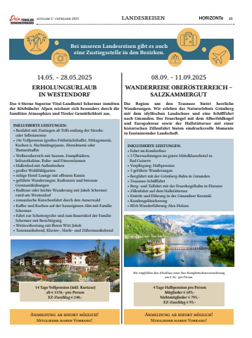 ausgabe 2 %u00b7 fr%u00fchjahr 2025 landesreisen 25Bei unseren Landesreisen gibt es auch eine Zustiegsstelle in den Bezirken.ERHOLUNGSURLAUB IN WESTENDORF WANDERREISE OBER%u00d6STERREICH %u2013 SALZKAMMERGUT14.05. - 28.05.2025 08.09. - 11.09.2025Das 4-Sterne Superior Vital-Landhotel Schermer inmitten der Kitzb%u00fcheler Alpen zeichnet sich besonders durch die famili%u00e4re Atmosph%u00e4re und Tiroler Gem%u00fctlichkeit aus. Die Region um den Traunsee bietet herrliche Wanderungen. Wir erleben das Naturerlebnis Gr%u00fcnberg mit dem idyllischen Laudachsee und eine Schifffahrt nach Gmunden. Der Feuerkogel mit dem Alberfeldkogel und Europakreuz sowie der Hallst%u00e4ttersee mit einer historischen Zillenfahrt bieten eindrucksvolle Momente in faszinierender Landschaft.INKLUDIERTE LEISTUNGEN:%u2022 Busfahrt mit Zustiegen ab Telfs entlang der Strecke oder Selbstanreise %u2022 14x Vollpension (gro%u00dfes Fr%u00fchst%u00fccksbuffet, Mittagsmen%u00fc, Kuchen u. Nachmittagsjause, Abendmen%u00fc oder Themenbuffet%u2022 Wellnessbereich mit Saunen, Dampfb%u00e4dern, Infrarotkabine, Ruhe- und Fitnessr%u00e4umen%u2022 Hallenbad mit Au%u00dfenbecken%u2022 gro%u00dfer Wohlf%u00fchlgarten%u2022 ruhige Hotel Lounge mit offenem Kamin%u2022 gef%u00fchrte Wanderungen, Radtouren und betreute Gymnastik%u00fcbungen %u2022 Radltour oder leichte Wanderung mit Jakob Schermer rund um Westendorf%u2022 romantische Kutschenfahrt durch den Aunerwald%u2022 Kaffee und Kuchen auf der hauseigenen Alm mit Familie Schermer%u2022 Fahrt zur Schottergrube und zum Bauernhof der Familie Schermer mit Besichtigung %u2022 Weinverkostung mit Ihrem Wirt Jakob%u2022 Tanzmusikabend, Klavier-, Harfe- und ZithermusikabendINKLUDIERTE LEISTUNGEN:%u2022 Fahrt im Komfortbus%u2022 3 %u00dcbernachtungen im guten Mittelklassehotel in Bad Goisern%u2022 Verpflegung: Halbpension%u2022 3 gef%u00fchrte Wanderungen%u2022 Bergfahrt mit der Gr%u00fcnberg-Bahn in Gmunden%u2022 Traunsee-Schifffahrt%u2022 Berg- und Talfahrt mit der Feuerkogelbahn in Ebensee%u2022 Zillenfahrt auf dem Hallst%u00e4ttersee%u2022 Eintritt und F%u00fchrung in der Gmundner Keramik%u2022 Kundengeldsicherung%u2022 RDA-Wanderf%u00fchrung Alex HolausAnmeldung ab sofort m%u00f6glich!Mitglieder haben Vorrang!Anmeldung ab sofort m%u00f6glich!Mitglieder haben Vorrang!14 Tage Vollpension (inkl. Kurtaxe)ab %u20ac 1370,- pro PersonEZ-Zuschlag %u20ac 240,-4 Tage Halbpension pro PersonMitglieder %u20ac 695,-Nichtmitglieder %u20ac 795,-EZ-Zuschlag %u20ac 95,-Wir empfehlen den Abschluss einer Bus-Komplettschutzversicherung um %u20ac 56,- pro Person.