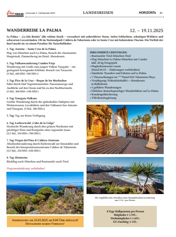 ausgabe 2 %u00b7 fr%u00fchjahr 2025 27WANDERREISE LA PALMA 12. %u2013 19.11.20258 Tage Halbpension pro PersonMitglieder %u20ac 1.595,- Nichtmitglieder %u20ac 1.695,-EZ-Zuschlag: %u20ac 345,-INKLUDIERTE LEISTUNGEN:%u2022 Bustransfer Tirol-M%u00fcnchen-Tirol%u2022 Flug M%u00fcnchen-La Palma-M%u00fcnchen mit Condor inkl. 20 kg Freigep%u00e4ck%u2022 Flughafensteuern/-taxen (Stand 04/25 %u2013 %u00c4nderungen vorbehalten)%u2022 S%u00e4mtliche Transfers und Fahrten auf La Palma%u2022 7 %u00dcbernachtungen im ****Hotel H10 Taburiente Playa%u2022 Verpflegung: Fr%u00fchst%u00fccksbuffet + Abendessen in Buffetform%u2022 5 gef%u00fchrte Wanderungen%u2022 %u00d6rtlicher deutschsprachiger Wanderf%u00fchrer auf La Palma%u2022 Kundengeldsicherung%u2022 TSB-ReisebegleitungLa Palma %u2013 %u201eLa Isla Bonita%u201c (die sch%u00f6ne Insel) %u2013 verzaubert mit unber%u00fchrter Natur, tiefen Schluchten, schattigen W%u00e4ldern und schwarzen Lavastr%u00e4nden. Ob im Nationalpark Caldera de Taburiente oder in Santa Cruz mit kolonialem Charme: Die Vielfalt der Insel macht sie zu einem Paradies f%u00fcr Naturliebhaber.1. Tag: Anreise %u2013 Santa Cruz de la PalmaFlug von M%u00fcnchen nach La Palma, Besuch der charmanten Hauptstadt, Zimmerbezug im Hotel, Abendessen.2. Tag: Vulkanwanderung Cumbre ViejaWanderung mit Guide zum jungen Vulkan Tajogaite %u2013 ein geologisch bewegendes Erlebnis. Besuch von Tazacorte. (3 Std., 600 HM-/100 HM+)3. Tag: Pico de la Cruz %u2013 Roque de los MuchachosFahrt durch f%u00fcnf Vegetationsstufen. Panoramawege und Ausblicke auf den Ozean und bis zu den Nachbarinseln. (3 Std., 300 HM+/100 HM-)4. Tag: Teneguia-VulkaneLeichte Wanderung durch die spektakul%u00e4re S%u00fcdspitze mit Weinterrassen, Lavafeldern und den Vulkanen San Antonio und Teneguia. (3 Std., 300 HM%u00b1)5. Tag: Tag zur freien Verf%u00fcgung6. Tag: Lorbeerwald %u201eCubo de la Galga%u201cMystische Wanderung durch den gr%u00fcnen Nordosten mit pr%u00e4chtiger Flora und Kostprobe einer regionaler Jause. (3,5 Std., 350 HM+/700 HM-)7. Tag: Virgen del Pino & Caldera-ZentrumAbschiedswanderung durch Kiefernwald zur Einsiedelei und Besuch des Interpretationszentrums Caldera de Taburiente. (3,5 Std., 250 HM+/650 HM-)8. Tag: HeimreiseR%u00fcckflug nach M%u00fcnchen und Bustransfer nach Tirol.Programm%u00e4nderung vorbehalten!Wir empfehlen den Abschluss einer Komplettschutzversicherung um %u20ac 115,- pro PersonAnmeldung am 22.05.2025 ab 8:00 Uhr m%u00f6glich!Mitglieder haben Vorrang!landesreisen