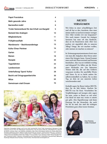 ausgabe 2 %u00b7 fr%u00fchjahr 2025 inhalt/vorwort 3Eigent%u00fcmer, Herausgeber, Verleger und f%u00fcr den Inhalt verantwortlich: Verein Tiroler Seniorenbund, Adamgasse 9, 6020 Innsbruck | Tel: 0512 58 01 68 | office@tiroler-seniorenbund.at | Satz und Layout: Atelier Roi | hello@atelierroi.at | ZVR-Zahl 361360185 | Irrt%u00fcmer, Druck- und Satzfehler vorbehalten. Fotos Tiroler Seniorenbund, Fotolia.com, Pixabay, Stoll Reisen, Reisedienst Alpbachtal, Athesia -Tappeiner Verlag, frischauf-bild, Gert Ammann, %u00a9Sabine Klimpt, pexels.com, %u00a9 IB-Wasser & Umwelt GmbH, Gerald Ringler, %u00a9 Land Tirol, %u00a9 B%u00f6rger GmbH, %u00a9 LFVWegscheider, %u00a9 Brixen Tourismus %u2013 Santifaller Photography, %u00a9 Bayern Tourismus Marketing GmbH/ Klaus Fengler, %u00a9 Cascata Varone, %u00a9 gwt_Starnberg_GmbH/ Thomas Marufke, %u00a9 bc_dues, %u00a9 R%u00f6misches Osttirol %u2013 Aguntum, %u00a9 Vorarlberg Tourismus/ Popp Hackner, %u00a9 erlebe.bayern_Bernhard Huber, %u00d6BB Harald Eisenberger, Wikipedia Vatican City-Map, %u00a9 Simon Fischler, %u00a9 Bernhard Geiler bernhardgeiler.com.NICHTS VERS%u00c4UMENEure Patrizia Zoller-FrischaufWir leben in einer schnelllebigen Zeit und oft hat es den Anschein, dass man immer mehr zu tun hat in immer weniger Zeit. Oder werden wir nur langsamer? Wie auch immer. Gerade bei r%u00fcstigen Senioren hat man oft den Eindruck, dass sie im Dauerstress sind. Aber was packen wir eigentlich alles in unseren Alltag? Dinge, die wir machen wollen, oder meinen sie machen zu m%u00fcssen?In Zeitmanagementseminaren lernt man wie man alle Aufgaben ohne Stress unter einen Hut bringen kann. Darauf kommt man auch mit Hausverstand und kurzem Innehalten. Also was ist wirklich wichtig und dringend? Da fallen mir die Worte eines Nachrufes ein: Die bittersten Tr%u00e4nen sind die, die auf den Gr%u00e4bern vergossen werden, f%u00fcr unerf%u00fcllte Worte und Taten. Es ist so leicht andere f%u00fcr selbstverst%u00e4ndlich zu halten, bis zu dem Tag, an dem sie aus unserem Leben verschwunden sind.Deshalb sagen Sie Ihren Lieben HEUTE, dass Sie sie lieb haben. Machen Sie HEUTE was Sie freut. Verschieben Sie Verpflichtungen auf morgen oder sagen Sie nein, wenn es Ihnen zu viel wird. Gut drauf ist man nur, wenn es einem gut geht. Also Eigenf%u00fcrsorge und dann F%u00fcrsorge f%u00fcr die Menschen, die auch f%u00fcr Sie da sind, das sind die richtigen Priorit%u00e4ten ganz ohne teures Seminar.Papst FranziskusMehr gesunde JahreBarrierefrei mobilTiroler Seniorenbund f%u00fcr den Erhalt von BargeldBestand des AnalogenMitgliederkarteFr%u00fchjahrsauftaktWanderserie %u2013 BezirkswandertageKultur Elmar PeintnerGartenBienenRezepteTagesfahrtenLandesreisenUnterhaltung/ Sport/ KulturBezirk und OrtsgruppenberichteWitzeGemeinsam statt Einsam46891011121516171820222528306570
