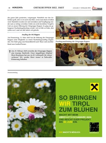32 ortsgruppen bez. imst ausgabe 2 %u00b7 fr%u00fchjahr 2025das ganze Jahr passierten, vorgetragen. Nat%u00fcrlich war das Gel%u00e4chter gro%u00df, aber es ist auch eine Ehre, wenn man darin erw%u00e4hnt wird. Nat%u00fcrlich wurden wir mit Getr%u00e4nken und Verpflegung wieder mal so richtig verw%u00f6hnt. Daf%u00fcr ein recht herzliches Vergelt%u2018s Gott an unsere F%u00fchrung der Ortsgruppe Roppen. So ging ein gelungener Nachmittagsfasching wieder viel zu fr%u00fch zu Ende, aber sch%u00f6n war%u2018s und wir alle haben viel gelacht.Am Donnerstag, 13. M%u00e4rz 2025 hat die F%u00fchrung der Ortsgruppe Roppen seine Mitglieder zu einem Nachmittagsausflug eingeladen. Die Fahrt ging zum Romedikirchl nach Thaur und anschlie%u00dfend zum Gasthof Purner.Ausflug der OG RoppenAm 23. Februar 2025 erreichte die Ortsgruppe Roppen eine traurige Nachricht. Unser langj%u00e4hriges Mitglied Horst Bergmann hat uns im 85. Lebensjahr f%u00fcr immer verlassen. Wir werden Horst immer in liebevoller Erinnerung behalten.WIR MACHT%u2019S M%u00d6GLICH. beeraiffeisen.atSO BRINGEN WIR TIROLZUM BL%u00dcHENMACHT MIT BEIM#BEERAIFFEISENAWARD 2025UND REICHT EUER PROJEKTBIS 30. JUNI EIN.FirmenmitteilungFaschingsnachmittag der Ortsgruppe Roppen