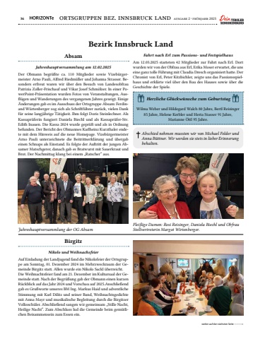 36 ortsgruppen bez. innsbruck land ausgabe 2 %u00b7 fr%u00fchjahr 2025Bezirk Innsbruck LandDer Obmann begr%u00fc%u00dfte ca. 110 Mitglieder sowie Vizeb%u00fcrgermeister Arno Pauli, Alfred Riedm%u00fcller und Johanna Strasser. Besonders erfreut waren wir %u00fcber den Besuch von Landesobfrau Patrizia Zoller-Frischauf und Vikar Josef Schm%u00f6lzer. In einer PowerPoint-Pr%u00e4sentation wurden Fotos von Veranstaltungen, Ausfl%u00fcgen und Wanderungen des vergangenen Jahres gezeigt. Einige %u00c4nderungen gab es im Ausschuss der Ortsgruppe Absam: Ferdinand W%u00fcrtenberger zog sich als Schriftf%u00fchrer zur%u00fcck, vielen Dank f%u00fcr seine langj%u00e4hrige T%u00e4tigkeit. Ihm folgt Doris Steinlechner. Als Kassapr%u00fcferin fungiert Daniela Biechl und als Kassapr%u00fcfer-Stv. Edith Inauen. Die Kassa 2024 wurde gepr%u00fcft und als in Ordnung befunden. Der Bericht des Obmannes Karlheinz Kurzthaler endete mit dem Hinweis auf die neue Homepage. Vizeb%u00fcrgermeister Arno Pauli unterzeichnete die Beitrittserkl%u00e4rung und %u00fcbergab einen Schnaps als Einstand. Es folgte der Auftritt der jungen Absamer Matschgerer, danach gab es Bratwurst mit Sauerkraut und Brot. Der Nachmittag klang bei einem %u201eRatscher%u201c aus.Auf Einladung der Landjugend fand die Nikolofeier der Ortsgruppe am Sonntag, 01.%u00a0Dezember 2024 im Mehrzweckraum der Gemeinde Birgitz statt. Allen wurde ein Nikolo Sackl %u00fcberreicht.Die Weihnachtsfeier fand am 21. Dezember im Kultursaal der Gemeinde statt. Nach der Begr%u00fc%u00dfung gab der Obmann einen kurzen R%u00fcckblick auf das Jahr 2024 und Vorschau auf 2025.Anschlie%u00dfend gab es Gru%u00dfworte unseres BM Ing. Markus Haid und adventliche Stimmung mit Karl Dilitz und seiner Band, Weihnachtsgedichte mit Anna Mayr und musikalische Begleitung durch die Birgitzer Volkssch%u00fcler. Abschlie%u00dfend sangen wir gemeinsam %u201eStille Nacht, Heilige Nacht%u201c. Zum Abschluss lud die Gemeinde beim gem%u00fctlichen Beisammensein zum Essen ein.Am 12.03.2025 starteten 42 Mitglieder zur Fahrt nach Erl. Dort wurden wir von der Obfrau aus Erl, Erika Moser erwartet, die uns eine ganz tolle F%u00fchrung mit Claudia Dresch organisiert hatte. Der Chronist von Erl, Peter Kitzbichler, zeigte uns das Passionsspielhaus und erkl%u00e4rte viel %u00fcber den Bau des Hauses sowie %u00fcber die Geschichte der Spiele.Jahreshauptversammlung am 12.02.2025Nikolo und WeihnachsfeierAbsam Fahrt nach Erl zum Passions- und FestspielhausBirgitzWilma Weber und Hildegard Walch 80 Jahre, Bertl Reisinger 85 Jahre, Helene Kerbler und Herta Stasser 91 Jahre, Marianne %u00d6ttl 95 Jahre.Herzliche Gl%u00fcckw%u00fcnsche zum GeburtstagAbschied nehmen mussten wir von Michael Felder und Anna B%u00fcttner. Wir werden sie stets in lieber Erinnerung behalten.weiter auf der n%u00e4chsten Seite --------->Jahreshauptversammlung der OG AbsamFlei%u00dfige Damen: Rosi Reisinger, Daniela Biechl und Obfrau Stellvertreterin Margot Wirtenberger.