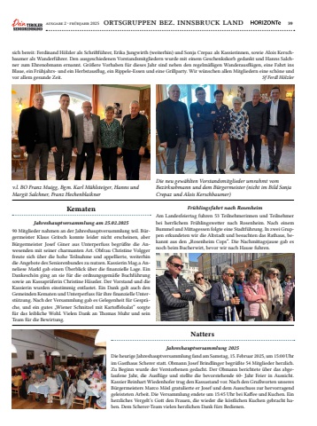 ausgabe 2 %u00b7 fr%u00fchjahr 2025 ortsgruppen bez. innsbruck land 3990 Mitglieder nahmen an der Jahreshauptversammlung teil. B%u00fcrgermeister Klaus Gritsch konnte leider nicht erscheinen, aber B%u00fcrgermeister Josef Giner aus Unterperfuss begr%u00fc%u00dfte die Anwesenden mit seiner charmanten Art. Obfrau Christine Volgger freute sich %u00fcber die hohe Teilnahme und appellierte, weiterhin die Angebote des Seniorenbundes zu nutzen. Kassierin Mag.a Anneliese Markl gab einen %u00dcberblick %u00fcber die finanzielle Lage. Ein Dankesch%u00f6n ging an sie f%u00fcr die ordnungsgem%u00e4%u00dfe Buchf%u00fchrung sowie an Kassapr%u00fcferin Christine H%u00e4usler. Der Vorstand und die Kassierin wurden einstimmig entlastet. Ein Dank galt auch den Gemeinden Kematen und Unterperfuss f%u00fcr ihre finanzielle Unterst%u00fctzung. Nach der Versammlung gab es Gelegenheit f%u00fcr Gespr%u00e4che, und ein gutes %u201eWiener Schnitzel mit Kartoffelsalat%u201c sorgte f%u00fcr das leibliche Wohl. Vielen Dank an Thomas Muhr und sein Team f%u00fcr die Bewirtung.Die heurige Jahreshauptversammlung fand am Samstag, 15. Februar 2025, um 15:00%u00a0Uhr im Gasthaus Scherer statt. Obmann Josef Brindlinger begr%u00fc%u00dfte 54%u00a0Mitglieder herzlich. Zu Beginn wurde der Verstorbenen gedacht. Der Obmann berichtete %u00fcber das abgelaufene Jahr, die Ausfl%u00fcge und stellte die bevorstehende 60- Jahr Feier in Aussicht. Kassier Reinhart Wiedenhofer trug den Kassastand vor. Nach den Gru%u00dfworten unseres B%u00fcrgermeisters Marco M%u00f6sl gratulierte er Josef und dem Ausschuss zur hervorragend geleisteten Arbeit. Die Versammlung endete um 15:45%u00a0Uhr bei Kaffee und Kuchen. Ein herzliches Vergelt%u2019s Gott den Frauen, die wieder die k%u00f6stlichen Kuchen gebracht haben. Dem Scherer-Team vielen herzlichen Dank f%u00fcrs Bedienen. Am Landesfeiertag fuhren 53 Teilnehmerinnen und Teilnehmer bei herrlichem Fr%u00fchlingswetter nach Rosenheim. Nach einem Bummel und Mittagessen folgte eine Stadtf%u00fchrung. In zwei Gruppen erkundeten wir die Altstadt und besuchten das Rathaus, bekannt aus den %u201eRosenheim Cops%u201c. Die Nachmittagsjause gab es noch beim Bucherwirt, bevor wir nach Hause fuhren.Jahreshauptversammlung am 25.02.2025Jahreshauptversammlung 2025Kematen Fr%u00fchlingsfahrt nach RosenheimNatterssich bereit: Ferdinand H%u00f6lzler als Schriftf%u00fchrer, Erika Jungwirth (weiterhin) und Sonja Crepaz als Kassierinnen, sowie Alois Kerschbaumer als Wanderf%u00fchrer. Den ausgeschiedenen Vorstandsmitgliedern wurde mit einem Geschenkskorb gedankt und Hanns Salchner zum Ehrenobmann ernannt. Gr%u00f6%u00dfere Vorhaben f%u00fcr dieses Jahr sind neben den regelm%u00e4%u00dfigen Wanderausfl%u00fcgen, eine Fahrt ins Blaue, ein Fr%u00fchjahrs- und ein Herbstausflug, ein Rippele-Essen und eine Grillparty. Wir w%u00fcnschen allen Mitgliedern eine sch%u00f6ne und vor allem gesunde Zeit. Sf Ferdl H%u00f6lzlerv.l. BO Franz Muigg, Bgm. Karl M%u00fchlsteiger, Hanns und Margit Salchner, Franz HechenblaiknerDie neu gew%u00e4hlten Vorstandsmitglieder umrahmt vom Bezirksobmann und dem B%u00fcrgermeister (nicht im Bild Sonja Crepaz und Alois Kerschbaumer)