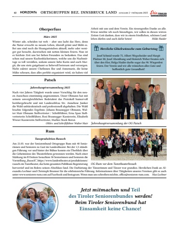 42 ortsgruppen bez. innsbruck land ausgabe 2 %u00b7 fr%u00fchjahr 2025Winter ade, scheiden tut weh %u2013 aber uns lacht das Herz, denn die Natur erwacht zu neuem Leben, %u00fcberall gr%u00fcnt und bl%u00fcht es. Bei uns sind noch die Hoangartstuben aktuell, mehr oder weniger gut besucht, dazwischen mit netten kleinen Feiern. Nun ist es h%u00f6chste Zeit uns bei lieben Freunden zu bedanken. Das sind schon mal unsere Kuchenb%u00e4ckerinnen, welche uns die Nachmittage so toll vers%u00fc%u00dfen, sodann unsere liebe Karin und auch Margit, die uns stets gutgelaunt so liebevoll betreuen und versorgen. Nicht zuletzt unsere Chefinnen Ilse und Annemarie, die keine M%u00fche scheuen, dass alles perfekt organisiert wird, sie haben viel Nach vier Jahren T%u00e4tigkeit wurde unser Vorschlag f%u00fcr den neuen Ausschuss einstimmig angenommen. Unser Obmann hat mit seinem unvergleichlichen Redetalent das Protokoll humorvoll her%u00fcbergebracht und mit Landesobfrau Stv. Anneliese Junker die Wahl unb%u00fcrokratisch und professionell abgehalten. Die Wahl brachte folgendes Ergebnis: Johann Braunegger Obmann, Walter Mair Obmann Stellvertreter / Schriftf%u00fchrer, Erna Span Stellvertreterin Schriftf%u00fchrer, Rosi Braunegger Kassiererin, Elisabeth Wieser Kassiererin Stellvertreter, Marlies Stock Beirat. ObStv. und Schriftf%u00fchrer Walter MairAm 21.03. war der Seniorenbund Ortsgruppe Rum mit 40 Seniorinnen und Senioren zu Gast im Landestheater. Bei der 1,5 st%u00fcndigen F%u00fchrung vor und hinter der B%u00fchne konnte ein %u00dcberblick %u00fcber die Geheimnisse des Theaterlebens gewonnen werden. Nach einer St%u00e4rkung im Il Dottore besuchten 30 Seniorinnen und Senioren die Vorstellung %u201eRausch%u201c, https://www.landestheater.at/produktionen/rausch ein Tanztheater, das beim gesamten Publikum Begeisterung M%u00e4rz 2025Jahreshauptversammlung 2025 Tanzproduktion RauschOberperfussPatschRumJosef Schmid wurde 75, Albert Wegscheider und Margit Plattner 80, Josef Abenthung und Heinrich Weber freuten sich %u00fcber den 85er, Helga Haider durfte sogar das 90.%u00a0Wiegenfest feiern. Der Verein und wir alle w%u00fcnschen alles Gute und hoffentlich gute Gesundheit!Herzliche Gl%u00fcckw%u00fcnsche zum GeburtstagArbeit mit uns und dem Verein. Ein riesengro%u00dfes Danke an alle. Etwas m%u00f6chte ich noch hinzuf%u00fcgen, wir sollen in diesen wirren Zeiten Gott danken, dass wir in einem friedlichen, sch%u00f6nen Land leben d%u00fcrfen und auch daf%u00fcr beten! Hilde Haiderhervorrief und im Bolero seinen Abschluss fand. Die Darbietung der T%u00e4nzerinnen und T%u00e4nzer war grandios. Herzlichen Dank an Alexandra Lechner und Christoph Brunner f%u00fcr die erlebnisreiche F%u00fchrung. Informationen %u00fcber T%u00e4tigkeiten unseres Vereines gibt es auch unter www.senioren-rum.com auf Facebook und Instagram. Wenn man uns schreiben m%u00f6chte, office@senioren-rum.com. Max LechnerJetzt mitmachen und Teildes Tiroler Seniorenbundes werden!Beim Tiroler Seniorenbund hat Einsamkeit keine Chance!Jahreshauptversammlung der OG PatschOG Rum vor dem Tanztheaterbesuch