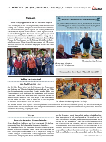 44 ortsgruppen bez. innsbruck land ausgabe 2 %u00b7 fr%u00fchjahr 2025Zum Auftakt ging es am Faschingsdienstag unter der bew%u00e4hrten Leitung von Anneliese Pranger ins wundersch%u00f6ne Gschnitztal. Die Strecke war bereits gut zu begehen (im Fr%u00fchling nicht immer selbstverst%u00e4ndlich) und die Einkehr im Gasthof Alpenrose machte den Nachmittag perfekt. Besonders hat uns gefreut, dass unser Ehrenobmann Erich Vattor und Obmann Dr. Franz Muigg mit dabei waren. Wie immer war alles perfekt organisiert, die umsichtige Planung der Wanderungen und die Nutzung %u00f6ffentlicher Verkehrsmittel tragen zum Erfolg dieses Aktivprogramms bei. Alle unsere Wanderer m%u00f6chten sich auf diesem Wege ganz herzlich bei Anneliese bedanken.Am 28. M%u00e4rz dieses Jahres hat die Ortsgruppe der Seniorinnen und Senioren von Telfes im Stubaital im Gemeindesaal von Telfes eine Fotopr%u00e4sentation veranstaltet. Gezeigt wurden Bilder von Veranstaltungen und Ausfl%u00fcgen der Seniorinnen und Senioren vom Jahre 1964 bis 2024. Bearbeitet und vorgestellt wurden die Bilder von Erika Haas und Peter Maurberger. Es war sehr interessant die Bilder aus alten Zeiten zu sehen und sich an Mitglieder zu erinnern, die nicht mehr unter uns weilen. Getreu dem Motto f%u00fcr K%u00f6rper und Geist besuchte die OG des Seniorenbundes Thaur das kulturreiche Museum in Rattenberg.Das ehemalige Kloster der Augustiner Eremiten beherbergt wunderbare Sch%u00e4tze der religi%u00f6sen Kunst. Davon %u00fcberzeugte sich bei einer F%u00fchrung mit Museumsleiterin Dr.in%u00a0Mag.a Petra Streng die Thaurer Gruppe. Klosterkirche, Kreuzganggew%u00f6lbe, herrliche Monstranzen, Heilige Figuren, Bilder und Votivgaben beeindruckUnsere Aktivgruppe WANDERN hat die Saison er%u00f6ffnetFoto R%u00fcckblick 1964 %u2013 2024Besuch im Augustiner Museum RattenbergSteinachTelfes im StubaitalThaurIm J%u00e4nner: Christine Mader Ofer 65, Renate Rauch 80 und Dr. Franz Muigg 75. Im Februar: Lorenz Feuerstein 85, Siegfried Schafferer 90 und Roland Jaun 70.Herzliche Gl%u00fcckw%u00fcnsche zum GeburtstagTotengedenken: Robert Tusch (79) am 01. M%u00e4rz 2025Wir werden sie aber stets in guter Erinnerung behalten. F%u00fcr das leibliche Wohl war auch bestens gesorgt, ein besonderer Dank gilt unserer Obfrau Ariane Macher und allen flei%u00dfigen Helferinnen und Helfern sowie Organisatorinnen und Organisatoren, welche zu dem feinen Nachmittag beigetragen haben.ten alle. Besonders wurde aber auf die au%u00dfergew%u00f6hnlichen Rarit%u00e4ten hingewiesen. So z.B. eine bewegliche Christusfigur, ein Hl. Josef mit Echthaar, Ferggelen und Prozessionsgegenst%u00e4nde, sowie ein Bild der %u201eHl. K%u00fcmmernis%u201c. Auch die Grabst%u00e4tte des Gr%u00fcnders und Pfandinhabers von Rattenberg Johann Kummersbrucker und seiner Gemahlin Anna von Castelbarco aus dem Jahre 1393 ist sehenswert. Das Museum wurde bereits mit verschiedenen Preisen ausgezeichnet und zieht Kunstinteressierte aus vielen L%u00e4ndern an.Nach so viel Kultur war es aber an der Zeit auch an den K%u00f6rper weiter auf der n%u00e4chsten Seite --------->Aktivgruppe Wandern Gschnitztal GH AlpenroseMonatsgeburtstag FebruarEin sch%u00f6ner Nachmittag bei der OG Telfes