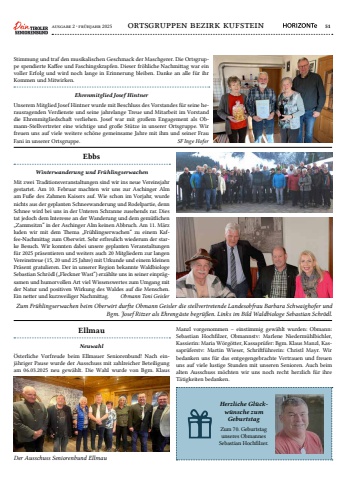 ausgabe 2 %u00b7 fr%u00fchjahr 2025 ortsgruppen bezirk kufstein 51Mit zwei Traditionsveranstaltungen sind wir ins neue Vereinsjahr gestartet. Am 10. Februar machten wir uns zur Aschinger Alm am Fu%u00dfe des Zahmen Kaisers auf. Wie schon im Vorjahr, wurde nichts aus der geplanten Schneewanderung und Rodelpartie, denn Schnee wird bei uns in der Unteren Schranne zusehends rar. Dies tat jedoch dem Interesse an der Wanderung und dem gem%u00fctlichen %u201eZammsitzn%u201c in der Aschinger Alm keinen Abbruch. Am 11. M%u00e4rz luden wir mit dem Thema %u201eFr%u00fchlingserwachen%u201c zu einem Kaffee-Nachmittag zum Oberwirt. Sehr erfreulich wiederum der starke Besuch. Wir konnten dabei unsere geplanten Veranstaltungen f%u00fcr 2025 pr%u00e4sentieren und weiters auch 20%u00a0Mitgliedern zur langen Vereinstreue (15, 20 und 25 Jahre) mit Urkunde und einem kleinen Pr%u00e4sent gratulieren. Der in unserer Region bekannte Waldbiologe Sebastian Schr%u00f6dl (%u201eFleckner Wast%u201c) erz%u00e4hlte uns in seiner einpr%u00e4gsamen und humorvollen Art viel Wissenswertes zum Umgang mit der Natur und positiven Wirkung des Waldes auf die Menschen. Ein netter und kurzweiliger Nachmittag. Obmann Toni Geisler%u00d6sterliche Vorfreude beim Ellmauer Seniorenbund! Nach einj%u00e4hriger Pause wurde der Ausschuss mit zahlreicher Beteiligung am 06.03.2025 neu gew%u00e4hlt. Die Wahl wurde von Bgm. Klaus Unserem Mitglied Josef Hintner wurde mit Beschluss des Vorstandes f%u00fcr seine herausragenden Verdienste und seine jahrelange Treue und Mitarbeit im Vorstand die Ehrenmitgliedschaft verliehen. Josef war mit gro%u00dfem Engagement als Obmann-Stellvertreter eine wichtige und gro%u00dfe St%u00fctze in unserer Ortsgruppe. Wir freuen uns auf viele weitere sch%u00f6ne gemeinsame Jahre mit ihm und seiner Frau Fani in unserer Ortsgruppe. SF Inge HoferWinterwanderung und Fr%u00fchlingserwachenNeuwahlEhrenmitglied Josef HintnerEbbsEllmauStimmung und traf den musikalischen Geschmack der Maschgerer. Die Ortsgruppe spendierte Kaffee und Faschingskrapfen. Dieser fr%u00f6hliche Nachmittag war ein voller Erfolg und wird noch lange in Erinnerung bleiben. Danke an alle f%u00fcr ihr Kommen und Mitwirken. Manzl vorgenommen %u2013 einstimmig gew%u00e4hlt wurden: Obmann: Sebastian Hochfilzer, Obmannstv: Marlene Niederm%u00fchlbichler, Kassierin: Maria W%u00f6rg%u00f6tter, Kassapr%u00fcfer: Bgm. Klaus Manzl, Kassapr%u00fcferstv: Martin Wieser, Schriftf%u00fchrerin: Christl Mayr. Wir bedanken uns f%u00fcr das entgegengebrachte Vertrauen und freuen uns auf viele lustige Stunden mit unseren Senioren. Auch beim alten Ausschuss m%u00f6chten wir uns noch recht herzlich f%u00fcr ihre T%u00e4tigkeiten bedanken.Zum 70. Geburtstag unseres Obmannes Sebastian Hochfilzer.Herzliche Gl%u00fcckw%u00fcnsche zum GeburtstagDer Ausschuss Seniorenbund EllmauZum Fr%u00fchlingserwachen beim Oberwirt durfte Obmann Geisler die stellvertretende Landesobfrau Barbara Schwaighofer und Bgm. Josef Ritzer als Ehreng%u00e4ste begr%u00fc%u00dfen. Links im Bild Waldbiologe Sebastian Schr%u00f6dl.