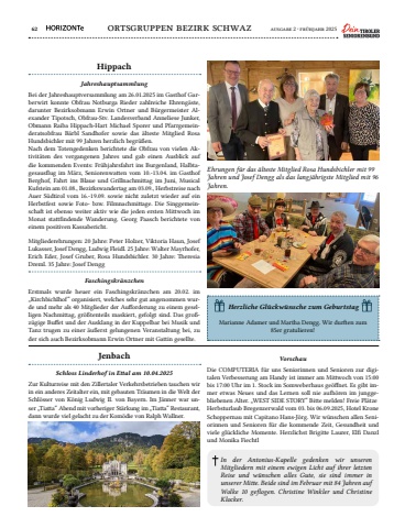 62 ortsgruppen bezirk schwaz ausgabe 2 %u00b7 fr%u00fchjahr 2025Bei der Jahreshauptversammlung am 26.01.2025 im Gasthof Garberwirt konnte Obfrau Notburga Rieder zahlreiche Ehreng%u00e4ste, darunter Bezirksobmann Erwin Ortner und B%u00fcrgermeister Alexander Tipotsch, Obfrau-Stv. Landesverband Anneliese Junker, Obmann Raiba Hippach-Hart Michael Sporer und Pfarrgemeinderatsobfrau B%u00e4rbl Sandhofer sowie das %u00e4lteste Mitglied Rosa Hundsbichler mit 99 Jahren herzlich begr%u00fc%u00dfen. Nach dem Totengedenken berichtete die Obfrau von vielen Aktivit%u00e4ten des vergangenen Jahres und gab einen Ausblick auf die kommenden Events: Fr%u00fchjahrsfahrt ins Burgenland, Halbtagesausflug im M%u00e4rz, Seniorenwatten vom 10.-13.04. im Gasthof Berghof, Fahrt ins Blaue und Grillnachmittag im Juni, Musical Kufstein am 01.08., Bezirkswandertag am 03.09., Herbstreise nach Auer S%u00fcdtirol vom 16.-19.09. sowie nicht zuletzt wieder auf ein Herbstfest sowie Foto- bzw. Filmnachmittage. Die Singgemeinschaft ist ebenso weiter aktiv wie die jeden ersten Mittwoch im Monat stattfindende Wanderung. Georg Paasch berichtete von einem positiven Kassabericht.Zur Kulturreise mit den Zillertaler Verkehrsbetrieben tauchen wir in ein anderes Zeitalter ein, mit gebauten Tr%u00e4umen in die Welt der Schl%u00f6sser von K%u00f6nig Ludwig II. von Bayern. Im J%u00e4nner war unser %u201eTiatta%u201c Abend mit vorheriger St%u00e4rkung im %u201eTiatta%u201c Restaurant, dann wurde viel gelacht zu der Kom%u00f6die von Ralph Wallner.Die COMPUTERIA f%u00fcr uns Seniorinnen und Senioren zur digitalen Verbesserung am Handy ist immer am Mittwoch von 15:00 bis 17:00 Uhr im 1. Stock im Somweberhaus ge%u00f6ffnet. Es gibt immer etwas Neues und das Lernen soll nie aufh%u00f6ren im junggebliebenen Alter. %u201eWEST SIDE STORY%u201c Bitte melden! Freie Pl%u00e4tze Herbsturlaub Bregenzerwald vom 03. bis 06.09.2025, Hotel Krone Schoppernau mit Capitano Hans-J%u00f6rg. Wir w%u00fcnschen allen Seniorinnen und Senioren f%u00fcr die kommende Zeit, Gesundheit und viele gl%u00fcckliche Momente. Herzlichst Brigitte Laurer, Elfi Danzl und Monika FiechtlErstmals wurde heuer ein Faschingskr%u00e4nzchen am 20.02. im %u201eKirchbichlhof%u201c organisiert, welches sehr gut angenommen wurde und mehr als 40 Mitglieder der Aufforderung zu einem geselligen Nachmittag, gr%u00f6%u00dftenteils maskiert, gefolgt sind. Das gro%u00dfz%u00fcgige Buffet und der Ausklang in der Kuppelbar bei Musik und Tanz trugen zu einer %u00e4u%u00dferst gelungenen Veranstaltung bei, zu der sich auch Bezirksobmann Erwin Ortner mit Gattin gesellte.Mitgliederehrungen: 20 Jahre: Peter Holzer, Viktoria Haun, Josef Lukasser, Josef Dengg, Ludwig Fleidl. 25 Jahre: Walter Mayrhofer, Erich Eder, Josef Gruber, Rosa Hundsbichler. 30 Jahre: Theresia Dreml. 35 Jahre: Josef DenggJahreshauptsammlungSchloss Linderhof in Ettal am 10.04.2025VorschauFaschingskr%u00e4nzchenHippachJenbachMarianne Adamer und Martha Dengg. Wir durften zum 85er gratulieren!Herzliche Gl%u00fcckw%u00fcnsche zum GeburtstagIn der Antonius-Kapelle gedenken wir unseren Mitgliedern mit einem ewigen Licht auf ihrer letzten Reise und w%u00fcnschen alles Gute, sie sind immer in unserer Mitte. Beide sind im Februar mit 84 Jahren auf Wolke 10 geflogen. Christine Winkler und Christine Klocker.Ehrungen f%u00fcr das %u00e4lteste Mitglied Rosa Hundsbichler mit 99 Jahren und Josef Dengg als das langj%u00e4hrigste Mitglied mit 96 Jahren.