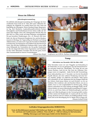 64 ortsgruppen bezirk schwaz ausgabe 2 %u00b7 fr%u00fchjahr 2025Die j%u00e4hrliche Jahreshauptversammlung der Ortsgruppe des Seniorenbundes Strass fand am 07. M%u00e4rz 2025 unter zahlreicher Beteiligung der Mitglieder im Gasthof Hotel Post statt. Nach der Begr%u00fc%u00dfung der Ehreng%u00e4ste, Pfarrer Bernhard Kopp, B%u00fcrgermeister Ing. Karl Eberharter, Landesobfraustellvertreterin Barbara Schwaighofer und Bezirksobmann Erwin Ortner stellte der Obmann Hans Ringler einen sehr umfangreichen Bericht %u00fcber das Jahr 2024 vor. Dabei wurde auf einige Erlebnisse zur%u00fcckgeblickt. Die gut besuchten Wanderungen, wie z. B. Pletzach Alm Sennh%u00fctte, die Alm im Wimmertal, Berglsteiner See und das Bergbaumuseum in Brixlegg. Der Tagesausflug ins Oberland, zur Festung Altfinsterm%u00fcnz, ist vielen noch wegen der besonderen %u00d6rtlichkeit in Erinnerung. Die Herbstreise nach S%u00fcdtirol mit dem Besuch der Seiser Alm und dem Wallfahrtsort Madonna della Corona stellte einen H%u00f6hepunkt des Vereinsleben dar. Ein gro%u00dfes Dankesch%u00f6n an alle, die mitgewirkt haben beim Organisieren und Durchf%u00fchren der vielen Aktivit%u00e4ten, besonders aber f%u00fcr den guten, herzlichen Zusammenhalt bei unseren Veranstaltungen. Obmann Hans RinglerMitte November waren wir zum T%u00f6rggelen am Kolsassberg in der Hoferstube. Es war ein gelungener Tag mit fantastischem Essen und guter Musik der %u201eOfenbankler%u201c aus Vomp, die uns zum Tanzen brachten. Auch bei der 50er Feier der Gallzeiner Ortsgruppe waren wir eingeladen %u2013 danke f%u00fcr die tolle Veranstaltung. Unser Jahresabschluss am 27. Dezember war bei der Kreuzbichl Kapelle dahoam, mit einer sch%u00f6nen Wanderung und einer kurzen Andacht, gefolgt von Gl%u00fchwein und Keksen. Mitte Januar 2025 erkundeten wir mit Altobmann Karl das Rangger K%u00f6pfl mit den Schiern. Ende Januar fuhren wir nach Pertisau, wo wir zur Falzthurn Alm wanderten oder mit Kutschen fuhren, um uns zu st%u00e4rken, bevor es zum Langlaufst%u00fcberl in Pertisau ging. Anfang Februar verbrachten wir einen Schitag am Rangger K%u00f6pfl. Am 06. Februar hielten wir unsere Jahreshauptversammlung im Vomperhof ab, wo auch Franz Huber als Wanderbeauftragten und Peter Kogler als E-Bike Beauftragten in den Vorstand gew%u00e4hlt wurden. Im M%u00e4rz startete die Plauderstube. Es wurde auch die erste Wanderung absolviert und wir nahmen am Fr%u00fchlingsauftakt in Innsbruck und an der Besichtigung der Fa. Binder Holz in F%u00fcgen teil.Obmann Gerhard PircherJahreshauptversammlungAktivit%u00e4ten von November 2024 bis M%u00e4rz 2025Strass im ZillertalVompTexte als Worddokument maximal 1000 Zeichen per Mail an uns senden. Alle erw%u00e4hnten Personen mit Vor- und dann mit Familiennamen anf%u00fchren. Fotos als JPG ca. 1 MB als Anhang im Mail mitsenden. Allf%u00e4llige K%u00fcrzungen und %u00c4nderungen beh%u00e4lt sich die Redaktion vor.Leitfaden Ortsgruppenberichte HORIZONTeGru%u00dfworte von LOB Stv. Barbara Schwaighofer
