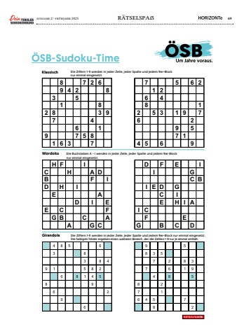 ausgabe 2 %u00b7 fr%u00fchjahr 2025 r%u00e4tselspa%u00df 69%u00d6SB-Sudoku-Time2938718916432567752487683189 26476851524365197916259217Klassisch Die Ziffern 1-9 werden in jeder Zeile, jeder Spalte und jedem 9er-Blocknur einmal eingesetzt.Girandola Die Ziffern 1-9 werden in jeder Zeile, jeder Spalte und jedem 9er-Block nur einmal eingesetzt.Die farbigen Felder ergeben einen weiteren Bereich, der die Zahlen 1-9 nur je einmal enth%u00e4lt.CBDEHEGFHCBHAIDICAFIGDACIEFAIGDICFIEFDCEBEGIHCIEGCADIBWordoku Die Buchstaben A - I werden in jeder Zeile, jeder Spalte und jedem 9er-Blocknur einmal eingesetzt.