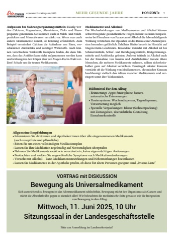 ausgabe 2 %u00b7 fr%u00fchjahr 2025 mehr gesunde jahre 7VORTRAG mit DISKUSSIONBewegung als UniversalmedikamentMittwoch, 11. Juni 2025, 10 UhrSich ausreichend zu bewegen ist das Altersmedikament schlechthin. Bewegung st%u00e4rkt den Organismus als Ganzes und st%u00e4rkt die Abwehrkr%u00e4fte gegen so ziemlich alles! Wir beleuchten die medizinische Seite genauso wie die Integration von Bewegung in den Alltag.%u00a0Bitte um Anmeldung im Landessekretariat!Aufpassen bei Nahrungserg%u00e4nzungsmitteln: H%u00e4ufig werden Calcium-, Magnesium-, Aluminium-, Zink- und Eisenpr%u00e4parate genommen. Sie kommen auch in Milch- und Milchprodukten und Mineralwasser verst%u00e4rkt vor. Wenn man auch andere Medikamente nimmt, ist Beratung erforderlich. Zum Beispiel vermindert Calcium die Aufnahme von Eisen, verschiedener Antibiotika und sonstiger Wirkstoffe. Auch k%u00f6nnen verschiedene Wirkstoffe Komplexe bilden, die dazu f%u00fchren, dass das Antibiotikum nicht aufgenommen werden kann und wirkungslos den K%u00f6rper %u00fcber den Magen-Darm-Trakt verl%u00e4sst! Schade um die teuren Medikamente.Allgemeine Empfehlungen%u2022 Informieren Sie %u00c4rzt:innen und Apotheker:innen %u00fcber alle eingenommenen Medikamente (auch rezeptfreie und pflanzliche)%u2022 Bitten Sie um einen vollst%u00e4ndigen Medikationsplan%u2022 Lassen Sie Ihre Medikation regelm%u00e4%u00dfig auf Notwendigkeit %u00fcberpr%u00fcfen%u2022 Nehmen Sie Medikamente exakt wie verordnet ein; keine eigenm%u00e4chtigen %u00c4nderungen%u2022 Beobachten und melden Sie ungew%u00f6hnliche Symptome nach Medikations%u00e4nderungen%u2022 Vorsicht mit Alkohol %u2013 kann Medikamentenwirkungen und Nebenwirkungen beeinflussen%u2022 Lassen Sie Medikamente in der Apotheke pr%u00fcfen, ob diese f%u00fcr %u00e4ltere Personen geeignet sind %u201ePriscus-Liste%u201cHilfsmittel f%u00fcr den Alltag%u2022 Erinnerungs-Apps: Smartphone-basiert, automatische Erinnerungen%u2022 Dosiersysteme: Wochendispenser, Tagesdispenser, Vorsortierung m%u00f6glich%u2022 Spezielle Verpackungen: Blister (Sichtverpackung) mit Zeitangaben, %u00fcbersichtliche Gestaltung, EinnahmekontrolleMedikamente und Alkohol:Die Wechselwirkungen von Medikamenten und Alkohol k%u00f6nnen schwerwiegende gesundheitliche Folgen haben! So kann beispielsweise bei Einnahme von Paracetamol Alkohol die lebersch%u00e4digende Wirkung verst%u00e4rken. Bei Opioiden ist das Risiko einer Atemdepression besonders gef%u00e4hrlich. Erh%u00f6htes Risiko besteht in Hinsicht auf Magen-Darm-Geschw%u00fcre. Besondere Vorsicht mit Alkohol ist bei Schmerzmitteln, Schlaf- und Beruhigungsmitteln, Blutgerinnungsmitteln und Antibiotika geboten. %u00c4u%u00dferst kritisch ist Alkohol auch bei der Einnahme von Insulin und Antidiabetika! Gerade %u00e4ltere Menschen, die mehrere Medikamente nehmen, sollten sicherheitshalber ganz auf Alkohol verzichten. Faustregel: Akuter Konsum verst%u00e4rkt oft die Wirkung von Medikamenten, chronischer Konsum beschleunigt vielfach den Abbau mancher Medikamente und verringert somit ihre Wirksamkeit.Sitzungssaal in der Landesgesch%u00e4ftsstelle