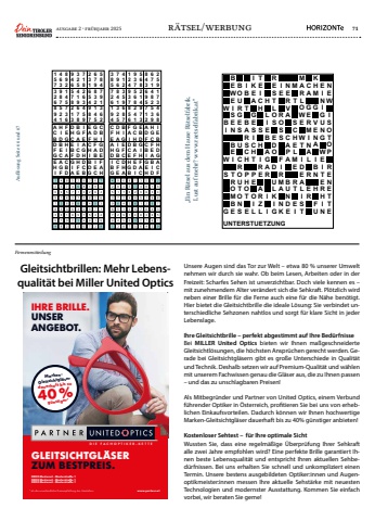 ausgabe 2 %u00b7 fr%u00fchjahr 2025 71FirmenmitteilungGleitsichtbrillen: Mehr Lebensqualit%u00e4t bei Miller United OpticsUnsere Augen sind das Tor zur Welt %u2013 etwa 80 % unserer Umwelt nehmen wir durch sie wahr. Ob beim Lesen, Arbeiten oder in der Freizeit: Scharfes Sehen ist unverzichtbar. Doch viele kennen es %u2013 mit zunehmendem Alter ver%u00e4ndert sich die Sehkraft. Pl%u00f6tzlich wird neben einer Brille f%u00fcr die Ferne auch eine f%u00fcr die N%u00e4he ben%u00f6tigt. Hier bietet die Gleitsichtbrille die ideale L%u00f6sung: Sie verbindet unterschiedliche Sehzonen nahtlos und sorgt f%u00fcr klare Sicht in jeder Lebenslage.Ihre Gleitsichtbrille %u2013 perfekt abgestimmt auf Ihre Bed%u00fcrfnisseBei MILLER United Optics bieten wir Ihnen ma%u00dfgeschneiderte Gleitsichtl%u00f6sungen, die h%u00f6chsten Anspr%u00fcchen gerecht werden. Gerade bei Gleitsichtgl%u00e4sern gibt es gro%u00dfe Unterschiede in Qualit%u00e4t und Technik. Deshalb setzen wir auf Premium-Qualit%u00e4t und w%u00e4hlen mit unserem Fachwissen genau die Gl%u00e4ser aus, die zu Ihnen passen %u2013 und das zu unschlagbaren Preisen!Als Mitbegr%u00fcnder und Partner von United Optics, einem Verbund f%u00fchrender Optiker in %u00d6sterreich, profitieren Sie bei uns von erheblichen Einkaufsvorteilen. Dadurch k%u00f6nnen wir Ihnen hochwertige Marken-Gleitsichtgl%u00e4ser dauerhaft bis zu 40% g%u00fcnstiger anbieten!Kostenloser Sehtest %u2013 f%u00fcr Ihre optimale SichtWussten Sie, dass eine regelm%u00e4%u00dfige %u00dcberpr%u00fcfung Ihrer Sehkraft alle zwei Jahre empfohlen wird? Eine perfekte Brille garantiert Ihnen beste Lebensqualit%u00e4t und entspricht Ihren aktuellen Sehbed%u00fcrfnissen. Bei uns erhalten Sie schnell und unkompliziert einen Termin. Unsere bestens ausgebildeten Optiker:innen und Augenoptikmeister:innen messen Ihre aktuelle Sehst%u00e4rke mit neuesten Technologien und modernster Ausstattung. Kommen Sie einfach vorbei, wir beraten Sie gerne!* als die unverbindliche Preisempfehlung des Herstellers. www.partner.atg%u00fcnstiger*MarkenGleitsichtgl%u00e4ser dauerhaft bis zu40 %D I E F A C H O P T I K E R - K E T T EGLEITSICHTGL%u00c4SER ZUM BESTPREIS.0000 Musterort %u00b7 Musterstra%u00dfe 10000 Musterort %u00b7 Musterstra%u00dfe 10000 Musterort %u00b7 Musterstra%u00dfe 1IHRE BRILLE.UNSER ANGEBOT.SymbolfotoAufl%u00f6sung KW 16WBIWSGBEWEISENBEITROMBEBOURGESUCROUTONSIBTBARSCHPHOTEIKEAGESICHTPEOILTEICHSHIREARZLHLIEBAGARIIRESTLOSEDODULKIGIEROSSFIRMANKNERVACAPABUNDEMTSCHELMERTEIMARLOWEWTIDEALISTCAGERMINALRERKHMGVENAIBNHFUEINIGUNGWEITERHINNEWISOTOPRENETTEUNTERSTUETZUNGRiesenschwede157326894463987521892145736946578213325419678718263459231654987679832145584791362385726194796841325412359687124937856937568241568214973843695712671482539259173468ACBDFGEHIHIDBECAGFFEGHIACBDDHCEBFGIABGAICDHFEIFEAGHDCBEAFCHIBDGGDHFABIECCBIGDEFAHCFEAHDIBGDHAIGBCFEBIGEFCDHAFAIDCEHGBGCHBAFEDIEBDGIHFACADFCBIGEHHGCFEABIDIEBHDGACFWordokuSudoku-klassischGirandolaWSGBEITROMBEUCROUTONSRSCHPHOTEICHTPEOILHIREARZLBAGARIIEDODULKIGSFIRMANKCAPABUNDEHELMERTEIWTIDEALISTINALRERNAIBNHFUGWEITERHINTOPRENETTEUNTERSTUETZUNG157326894463987521892145736946578213325419678718263459231654987679832145584791362385726194796841325412359687124937856937568241568214973843695712671482539259173468ACBDFGEHIHIDBECAGFFEGHIACBDDHCEBFGIABGAICDHFEIFEAGHDCBEAFCHIBDGGDHFABIECCBIGDEFAHCFEAHDIBGDHAIGBCFEBIGEFCDHAFAIDCEHGBGCHBAFEDIEBDGIHFACADFCBIGEHHGCFEABIDIEBHDGACFWordokuSudoku-klassischGirandolaAufl%u00f6sung Seite 66 und 67r%u00e4tsel/werbung %u201eEin R%u00e4tsel aus dem Hause R%u00e4tselfabrik. Lust auf mehr? www.raetselfabrik.at%u201c