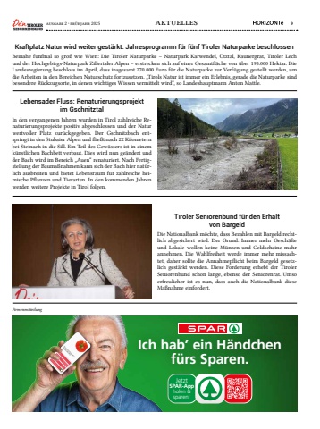 ausgabe 2 %u00b7 fr%u00fchjahr 2025 aktuelles 9Kraftplatz Natur wird weiter gest%u00e4rkt: Jahresprogramm f%u00fcr f%u00fcnf Tiroler Naturparke beschlossen Lebensader Fluss: Renaturierungsprojekt im GschnitztalTiroler Seniorenbund f%u00fcr den Erhalt von BargeldBeinahe f%u00fcnfmal so gro%u00df wie Wien: Die Tiroler Naturparke %u2013 Naturpark Karwendel, %u00d6tztal, Kaunergrat, Tiroler Lech und der Hochgebirgs-Naturpark Zillertaler Alpen %u2013 erstrecken sich auf einer Gesamtfl%u00e4che von %u00fcber 193.000 Hektar. Die Landesregierung beschloss im April, dass insgesamt 270.000 Euro f%u00fcr die Naturparke zur Verf%u00fcgung gestellt werden, um die Arbeiten in den Bereichen Naturschutz fortzusetzen. %u201eTirols Natur ist immer ein Erlebnis, gerade die Naturparke sind besondere R%u00fcckzugsorte, in denen wichtiges Wissen vermittelt wird%u201c, so Landeshauptmann Anton Mattle. In den vergangenen Jahren wurden in Tirol zahlreiche Renaturierungsprojekte positiv abgeschlossen und der Natur wertvoller Platz zur%u00fcckgegeben. Der Gschnitzbach entspringt in den Stubaier Alpen und flie%u00dft nach 22 Kilometern bei Steinach in die Sill. Ein Teil des Gew%u00e4ssers ist in einem k%u00fcnstlichen Bachbett verbaut. Dies wird nun ge%u00e4ndert und der Bach wird im Bereich %u201eAuen%u201c renaturiert. Nach Fertigstellung der Bauma%u00dfnahmen kann sich der Bach hier nat%u00fcrlich ausbreiten und bietet Lebensraum f%u00fcr zahlreiche heimische Pflanzen und Tierarten. In den kommenden Jahren werden weitere Projekte in Tirol folgen. Die Nationalbank m%u00f6chte, dass Bezahlen mit Bargeld rechtlich abgesichert wird. Der Grund: Immer mehr Gesch%u00e4fte und Lokale wollen keine M%u00fcnzen und Geldscheine mehr annehmen. Die Wahlfreiheit werde immer mehr missachtet, daher sollte die Annahmepflicht beim Bargeld gesetzlich gest%u00e4rkt werden. Diese Forderung erhebt der Tiroler Seniorenbund schon lange, ebenso der Seniorenrat. Umso erfreulicher ist es nun, dass auch die Nationalbank diese Ma%u00dfnahme einfordert. -25% auf einen Lebensmitteloder Getr%u00e4nkeartikelZeitraumG%u00fcltig beiEinl%u00f6sbarVor Ablauf benachrichtigenEinl%u00f6sebedingungenPro Artikel kann jeweils nur ein Gutschein eingel%u00f6st werden. Keine Barabl%u00f6se m%u00f6glich.Nur so lange der Vorrat reicht.SPAR, EUROSPAR & INTERSPAR MehrfachIch hab%u2019 ein H%u00e4ndchen f%u00fcrs Sparen.JetztSPAR-Appholen & sparen!Firmenmitteilung