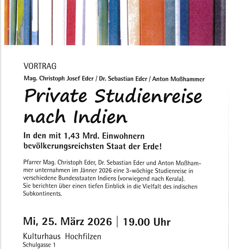 Vortrag von Mag. Christoph Josef Eder , Dr. Sebastian Eder und Anton Moßhammer Über Ihre private Studienreise nach Indien Mittwoch den 25. März 2026 – 19 Uhr Im Kultursaal Hochfilzen Siehe Vortrag Indien