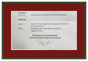 Weiters der Hopfgartner Christkindlmarkt, am 8. Dezember mit Beteiligung der Hopfgartner Senioren. Versorgungsstand : Weißer Glühwein, Kinderpunsch und Fleischkäsesemmel.